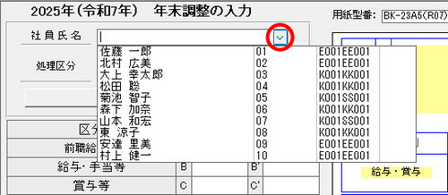 | (3) | 源泉徴収票作成画面が表示されますので、画面左側の「年末調整の入力」画面で、[社員氏名]欄の[▼]ボタンをクリックし、対象の社員名を選択します。 |
