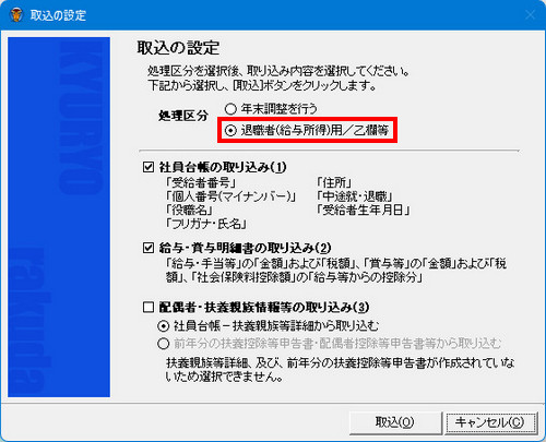| (4) | 「取込の設定」画面が表示されますので、「処理区分」で「退職者(給与所得)用/乙欄等」を選択し、取り込む内容にチェックを付け、[取込]ボタンをクリックします。 |