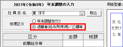 | (5) | [社員氏名]欄の下にある[処理区分]の中で、[退職者(給与所得)用/乙欄等]が選択されていることを確認します。 |
