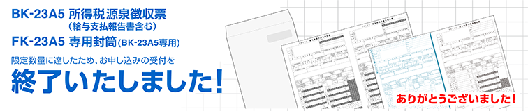「BK-23A5 源泉徴収(令和6年分)」の受付けは終了いたしました。 多数のご注文をいただき、ありがとうございました!